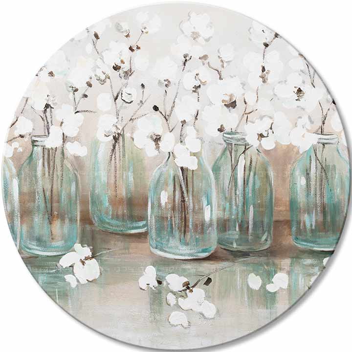 Okrogle slike, ki se razlikujejo od tradicionalnih pravokotnih oblik, dodajo element tekočnosti in vizualne neskončnosti vsaki notranjosti. Njihova edinstvena oblika širi meje tradicionalnega dojemanja umetnosti, odpira nove možnosti kompozicije in oblikovanja ter v vaše domove in pisarne vnaša dinamiko in svežino.