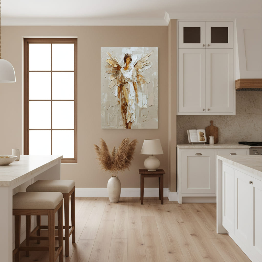 Angeli že od nekdaj veljajo za zaščitnike in glasnike miru. V zgodovini umetnosti so bili pogosto upodobljeni kot nežna in miroljubna bitja, ki prinašajo upanje in duhovno harmonijo. Na renesančnih slikah so angeli služili kot simbol božanske prisotnosti, zlati elementi v teh delih pa so poudarjali njihovo zunajzemeljsko naravo. Danes sodobne obdelave angelskih slik združujejo te tradicionalne vrednote s sodobnim umetniškim pristopom in ustvarjajo dela, ki odmevajo v sodobnih interierjih.